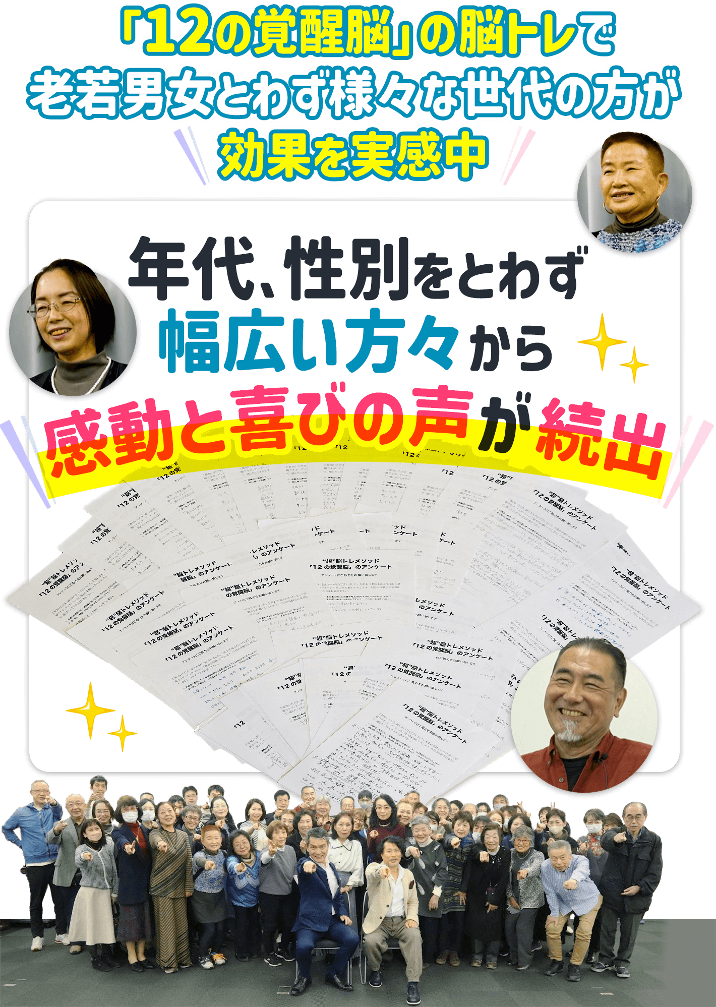 「12の覚醒脳」理論による3つのポイントをおさえた、脳機能を最大限活性化させる脳活メソッドを体感できます。