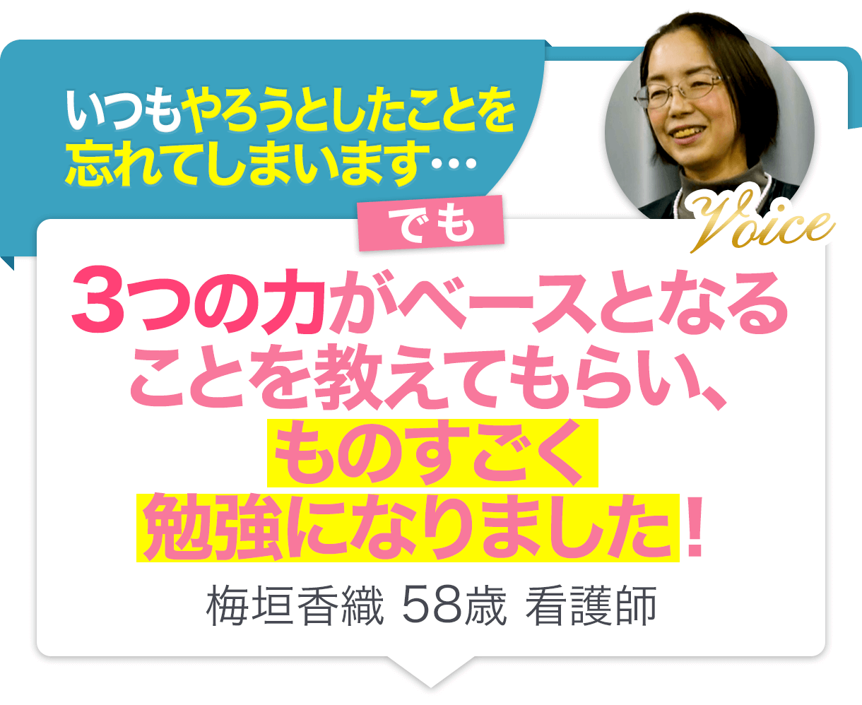 私は人の名前を覚えるのが苦手というのと、携帯電話をよく置き忘れてしまうのがあり、解決したいなと思い、受講しました。