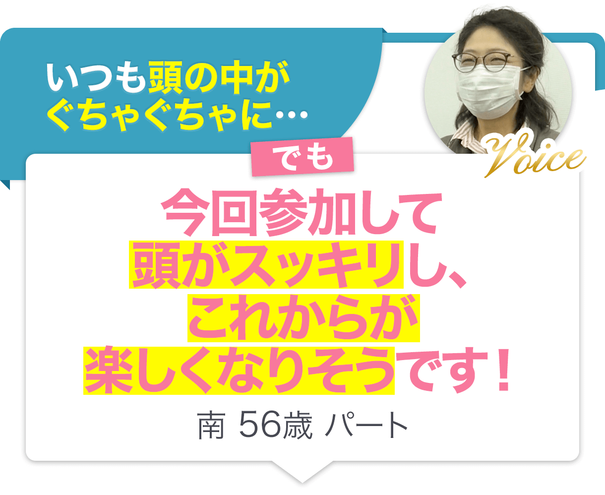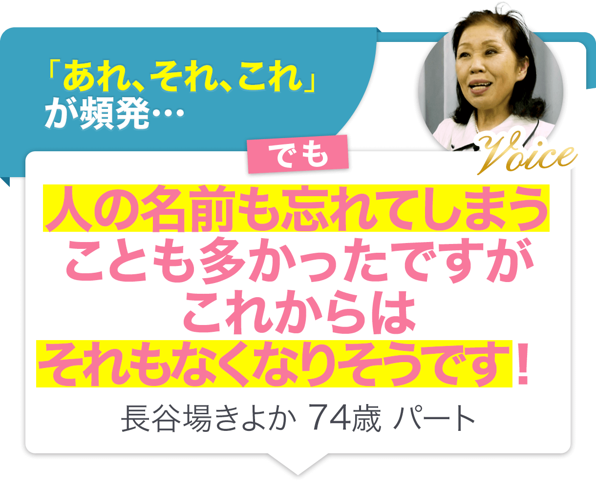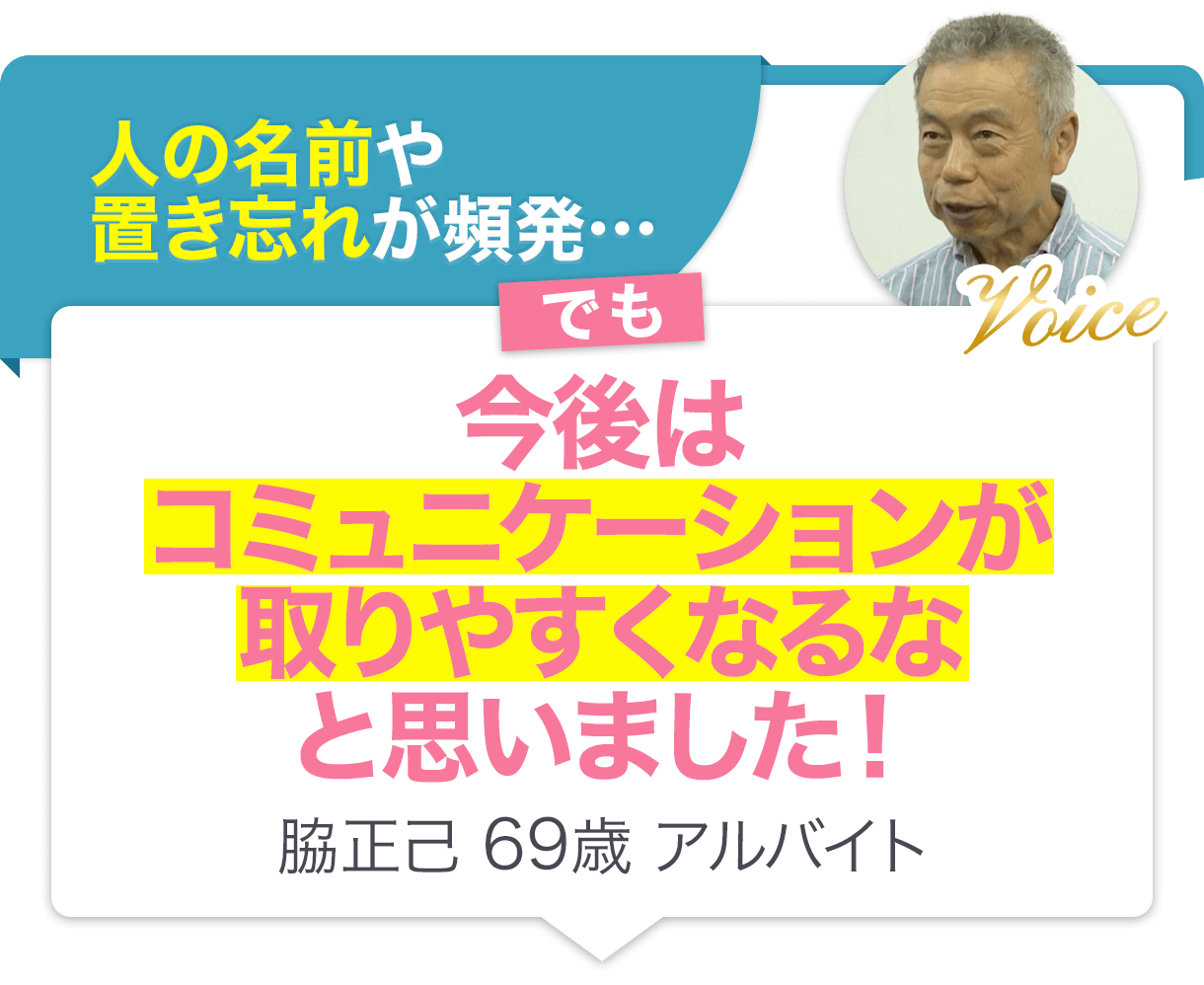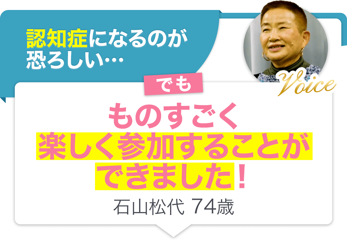 参加前は、もの忘れがひどく、思い出せないことが多々あったのが悩みで認知症予防にもなるかと思い、参加させていただきました。